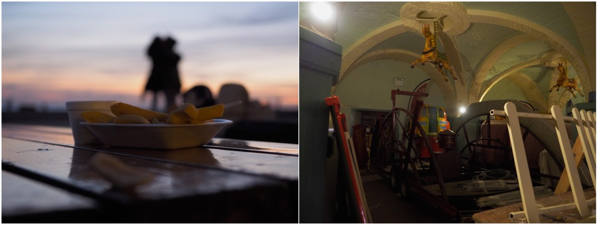 All I wanted to do was get a picture of this abandoned plate of chips backlit by the sunset, and these lovers came and stood right behind it and snogged for what seemed like hours. Eventually I gave up and included them in the shot. It was only then that I realised why, today, I had stumbled across several men with pained expressions kneeling on pebbles in front of their girlfriends (it must really hurt kneeling on pebbles) and a larger number than usual of lost balloons drifting through the streets. Well well, it’s Valentine’s day, again. Where does the time go?